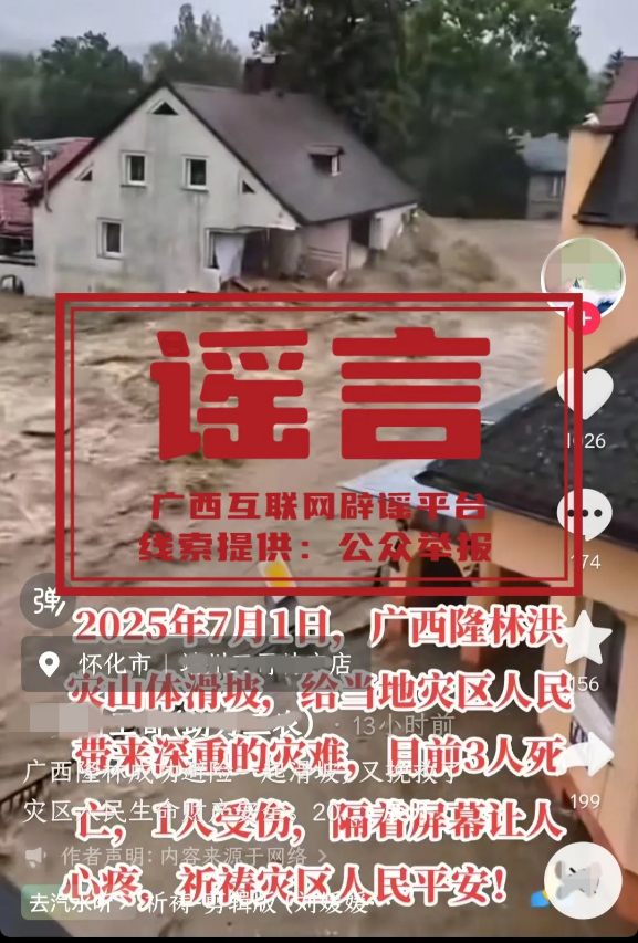 7月3日,部分网民在短视频平台发布视频称“广西隆林洪灾造成12人死亡”“ 2025年7月1日,广西隆林洪灾山体滑坡,给当地灾区人民带来深重的灾难,目前3人死亡,1人受伤,隔着屏幕让人心疼,祈祷灾区人民平安!”引发网民关注。