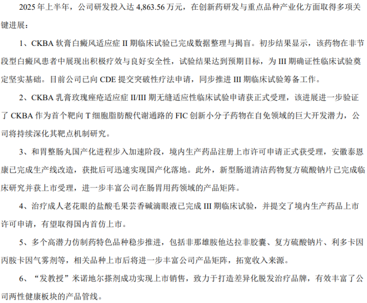 其次是研发投入的增加。“公司正在推进多个品种的二期临床和研发,研发支出比以前多了很多。但企业发展不能只看短期利润,如果为了短期利益缩减必要的研发投入,未来就会失去竞争力。研发是创新药企业的‘生命线’,现阶段必须坚持投入。”
